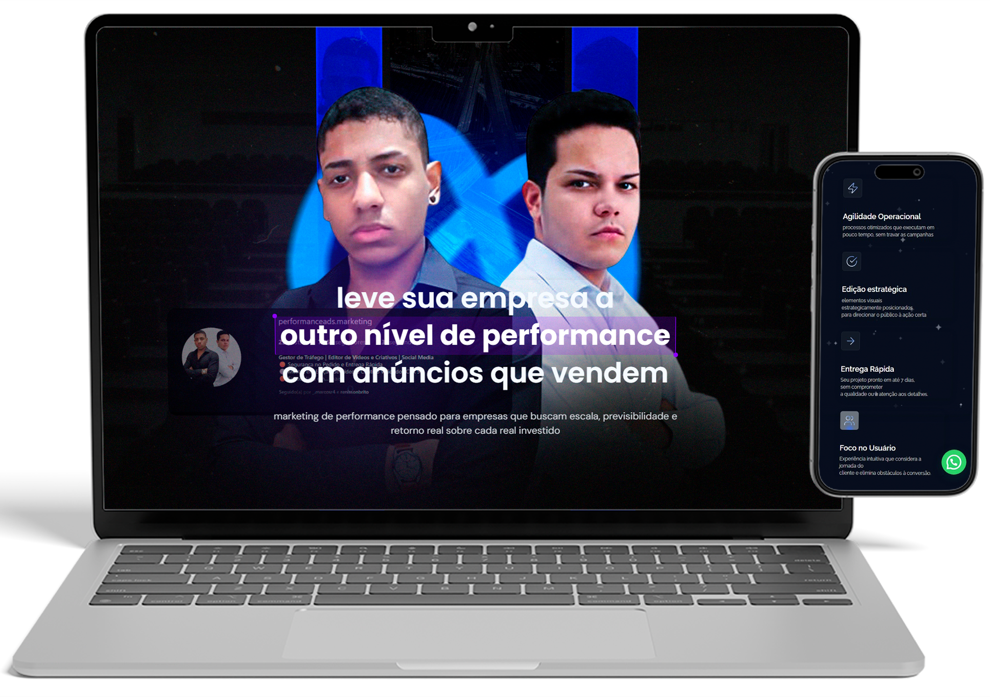 nós executamos toda a estratégia de performance ads do início ao fim, cuidando da criação, otimização e escala das campanhas para gerar vendas, crescimento previsível e resultado real para sua empresa.